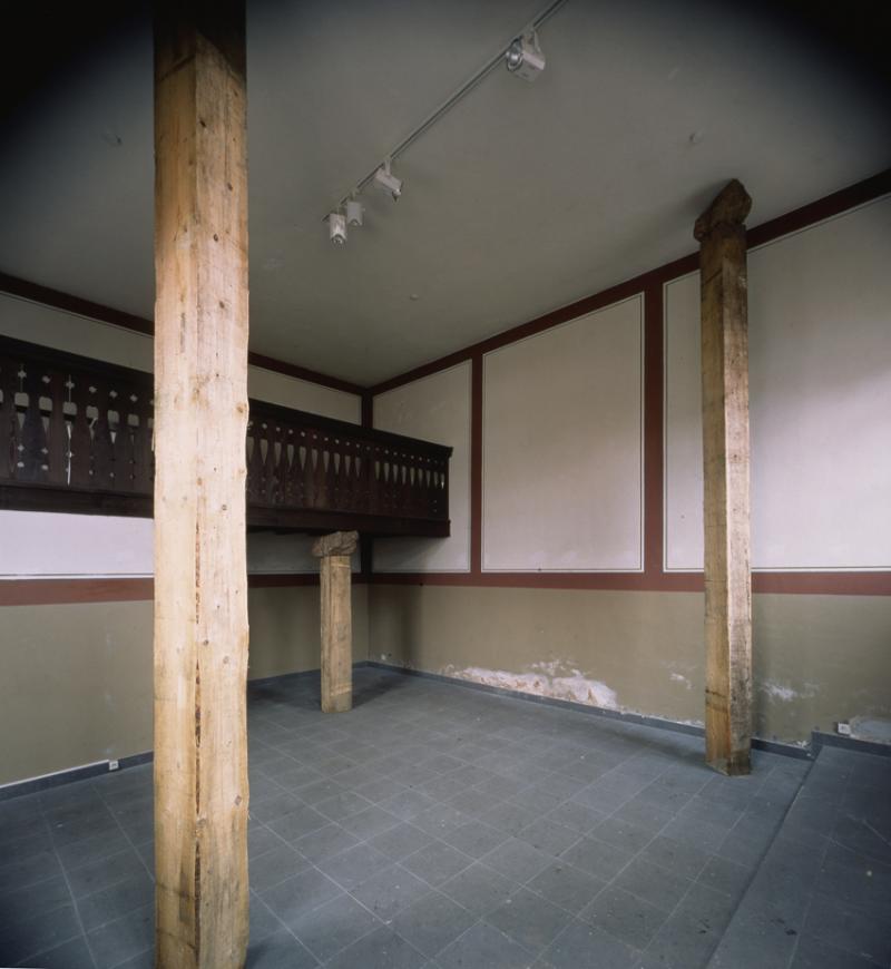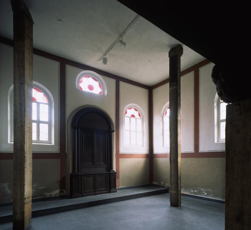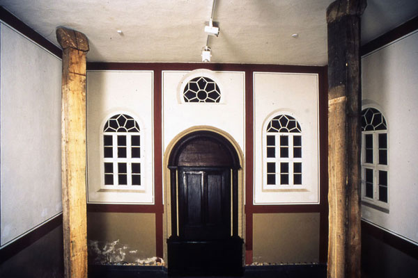 Zwölf leere Haken stecken, Kleiderhaken gleich, in der Rückwand der Synagoge. Die Abstände von Haken zu Haken sind so gewählt, dass die Schatten, die sie werfen, immer länger werden. Drei wuchtige, grob behauene Balken sind senkrecht in den Raum gestellt und bilden im Grundriss die Eckpunkte eines gleichseitigen Dreiecks. Die Balken scheinen die Decke und die Balustrade der Synagoge zu stützen. Zugleich sind drei schwere Felsblöcke, die an Kapitelle erinnern, mit Draht provisorisch oben auf den Balken befestigt.