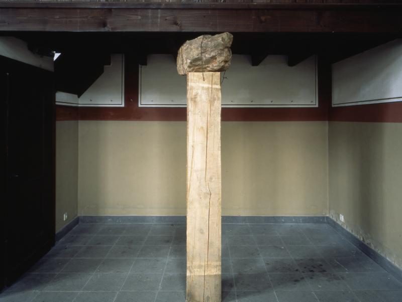 Es findet eine Bewegung von oben nach unten und von unten nach oben statt: Die Decke und die Balustrade drücken auf die Balken, als bedürfe das erst kurz zuvor restaurierte Gebäude (und das, wofür es steht) dieser Unter-Stützung. Zugleich heben die Balken die Felsen nach oben, eine Kraft, die den Druck der Decke auf die Säulen formal auszugleichen scheint, so dass ein „schwerer“ Schwebezustand eintritt. Das Dreieck, das durch die Balken gebildet wird, ist sperrig in den Raum geschrieben, unterstützt die vorhandene Achsensymmetrie nicht, sondern verhakt sich aus der Symmetrie geschoben beinahe schmerzhaft darin.