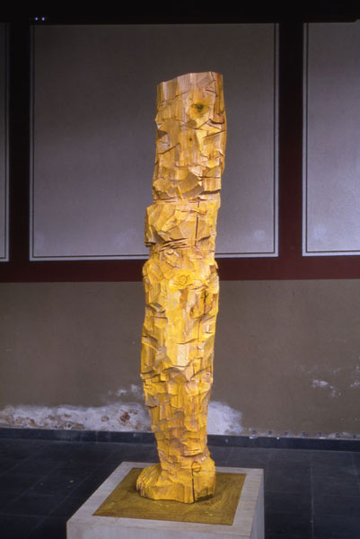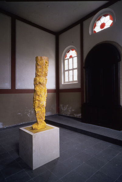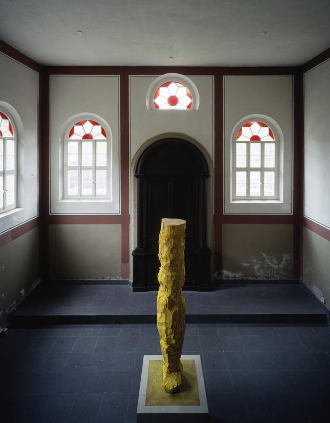 Baselitz stellt bei der Pressekonferenz anlässlich der Ausstellungseröffnung die Frage, ob die Synagoge Stommeln nicht das Ausstellungszentrum der Gemeinde Stommeln sei. Diese ironische Spitze macht deutlich, welche Position Baselitz zu der historischen Aufladung dieses Gebäudes einnimmt. Er ignoriert die Bedeutung des Gebäudes als ehemalige jüdische Synagoge und verweigert sich dem in Verbindung mit jüngerer deutscher Geschichte allzu oft zum Reflex verkümmerten Betroffenheitsgestus. Er stellt eine hölzerne Skulptur in den Ausstellungsraum, grob bearbeitet mit Kettensäge und Beil, leuchtend gelb bemalt und auf einem Sockel präsentiert. Die Affinität zu der Farbe Gelb stamme möglicherweise von den beiden Kanarienvögeln, die sein Vater besessen habe, bemerkt Baselitz. Obwohl das Gelb zusammen mit dem Rot der Fenster und dem beinahe schwarzen Thora-Schrein die einzige klare Farbe im Innenraum der Synagoge darstellt, er also dem Schwarz und dem Rot das Gelb hinzustellt und damit wohl nicht zufällig politische Assoziationen auslöst, schlägt Baselitz mit Künstlerattitüde und Ironie Haken um Haken, versucht Deutungen zu entgehen und verbindet so seine Arbeit einzig mit dem System Kunst. Gerade an ihn als deutschen Künstler, der als erster nach Kounellis und Serra eingeladen wurde, auf diesen Ort zu reagieren, wurden hohe Erwartungen gestellt, die er einzig aus dem System Kunst heraus pariert und dadurch enttäuscht. Dadurch reagiert er indirekt auf die Institutionalisierung der Betroffenheit und Scham und die Vereinnahmung der Kunst durch gesellschaftliches und/oder politisches Wollen. Auf die Frage, warum er in der Synagoge Stommeln ausstelle, antwortete Baselitz: Weil Kounellis und Serra hier auch ausgestellt haben. Er lässt sich also in seiner Argumentation erst gar nicht auf andere Systeme als auf das System Kunst ein.