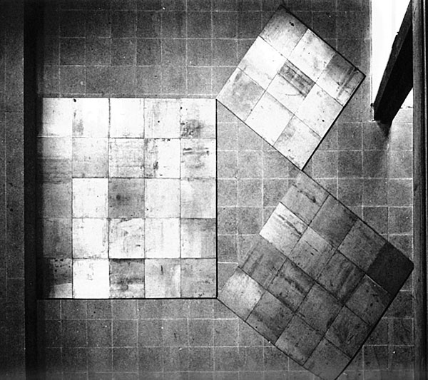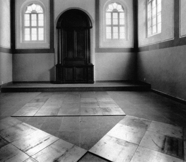 "Matter" und "Place", Material im Verhältnis zum Ort, sind wesentliche konstituierende Elemente der skulpturalen Arbeiten Carl Andres. Der Ort, die Synagoge ist bis ins Schmerzliche aufgeladen durch die gemeinsame deutsch-jüdische Vergangenheit, zugleich aber auch entleert nicht zuletzt durch die Redundanz der nur zu oft zur bloßen Formel gediehenen Betroffenheitsbekundungen, leer aber auch durch die Abwesenheit der gesellschaftlichen Gruppe, die für viele Jahrhunderte maßgeblich prägender Teil der deutschen Kultur gewesen ist. Leere durchdringt diesen Ort, und das ist eine andere Leere als die des white cube oder der black box.