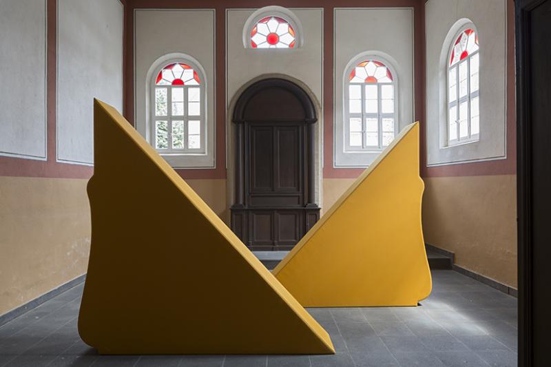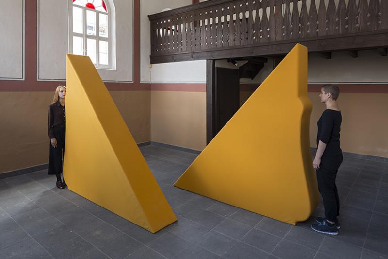 In der Synagoge zeigt Walther seine Arbeit Zwei Körperformen GELB, lebensgroße Dreiecke aus Stoff, deren unregelmäßige Aussparungen der menschlicher Silhouette entsprechen. Das auf Partizipation angelegte Werk wird bei der Eröffnung und bei weiteren Terminen durch Performer und Performerinnen aktiviert. Während der Ausstellungszeit sind die Besucher eingeladen, näher zu treten, mit dem eigenen Körper die Aussparungen zumindest gedanklich zu ergänzen und somit nicht nur Teil des Werks zu werden, sondern darüber hinaus die Beziehung zwischen Körper und Raum nachzuvollziehen.