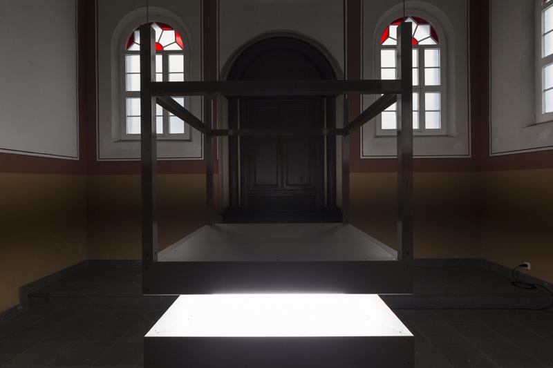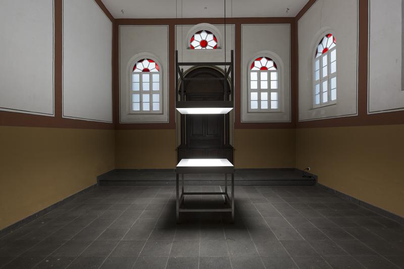 Jaars Arbeit für die Synagoge, "Lament of the Images" (2002/2019), besteht aus zwei Leuchttischen, von denen sich einer, kopfüber über dem anderen hängend, in regelmäßigen Abständen hebt und wieder senkt. Dabei erleuchtet er den Raum, wenn er sich hebt, und versetzt ihn in Halbdunkel, wenn er sich senkt. Im Kontext einer ehemaligen Synagoge lässt Jaars Werk nicht nur eine Klage über den Verlust der symbolischen Wirkung des Bildes assoziieren, - eine Klage, die sich in vielen Werken des Künstlers findet -, sondern auch eine Klage über die zahllosen Verfolgungen des jüdischen Volkes.